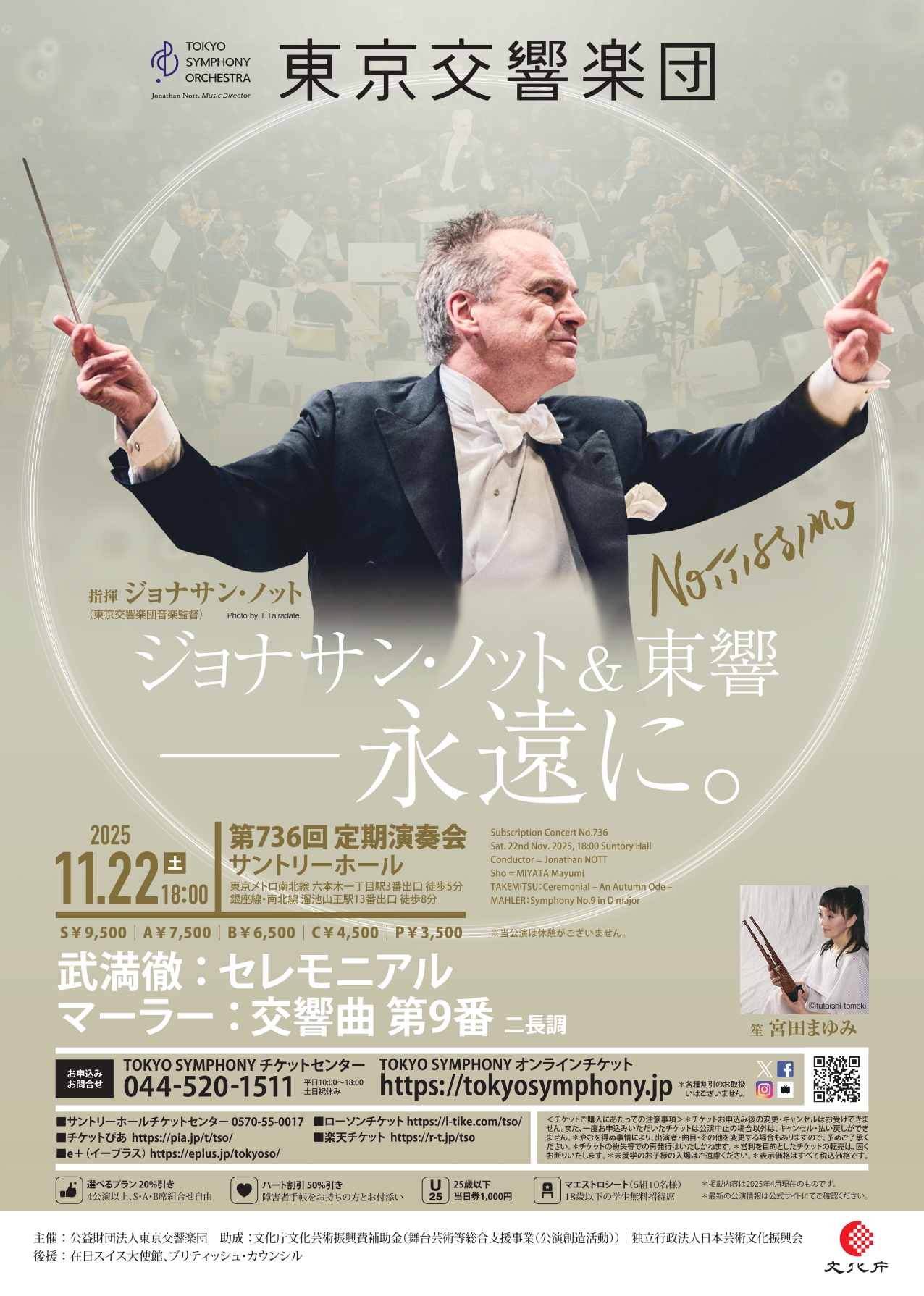 2025年11月22日 東京交響楽団第736回 定期演奏会 コメントを残す 東京交響楽団第736回 定期演奏会 日時:2025年11月22日(土)18:00開演 会場:サントリーホール 料金:S席9,500円 A席7,500円 B席6,500円 C席4,500円 P席3,500円 <出演> 指揮:ジョナサン・ノット 笙:宮田まゆみ 東京交響楽団 <プログラム> 武満徹:セレモニアル マーラー:交響曲 第9番 ニ長調 参加しています
