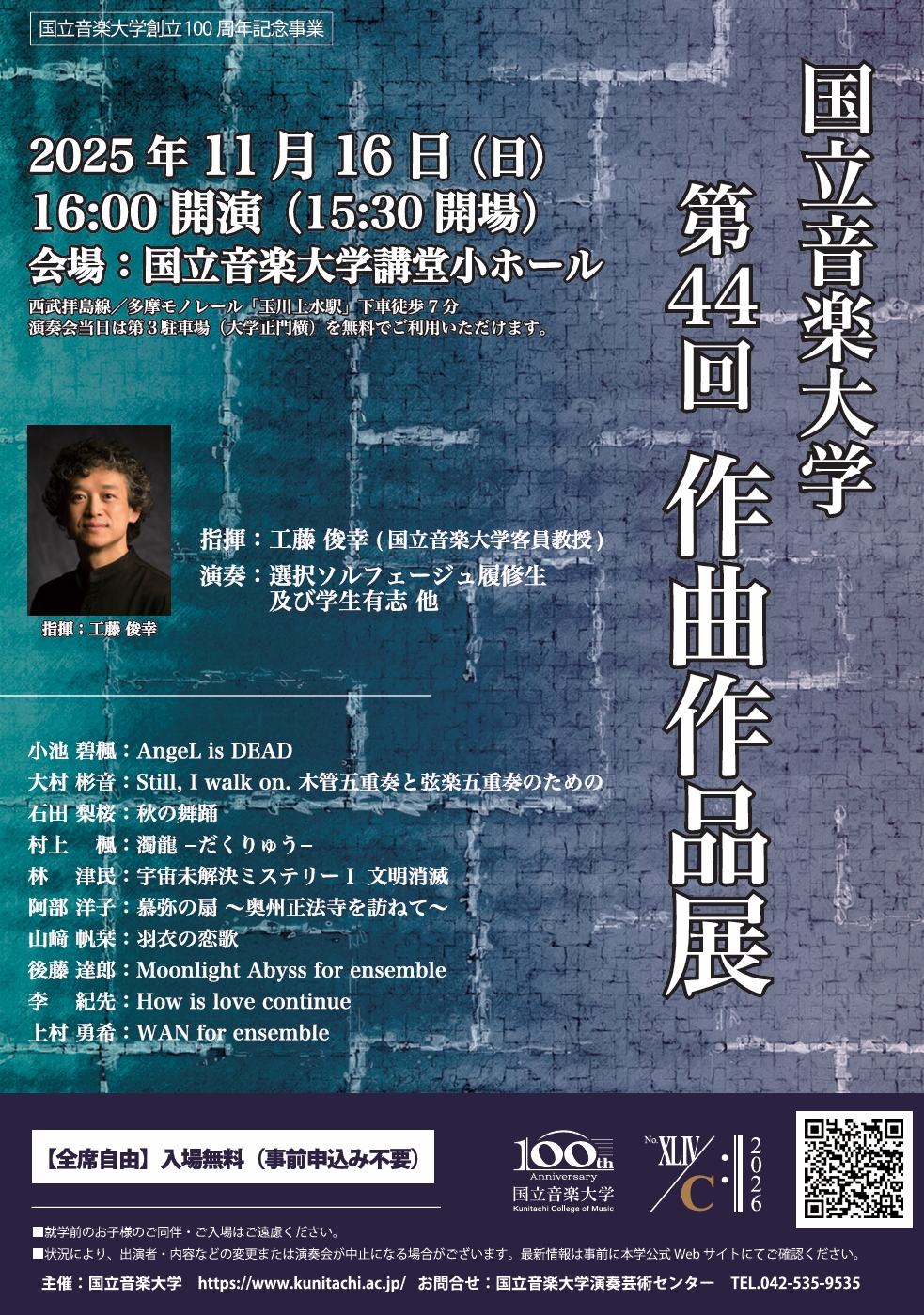 2025年11月16日 国立音楽大学第44回作曲作品展 コメントを残す 国立音楽大学第44回作曲作品展 日時:2025年11月16日(日)16:00開演 会場:国立音楽大学講堂小ホール 料金:無料(申込不要) 参加しています