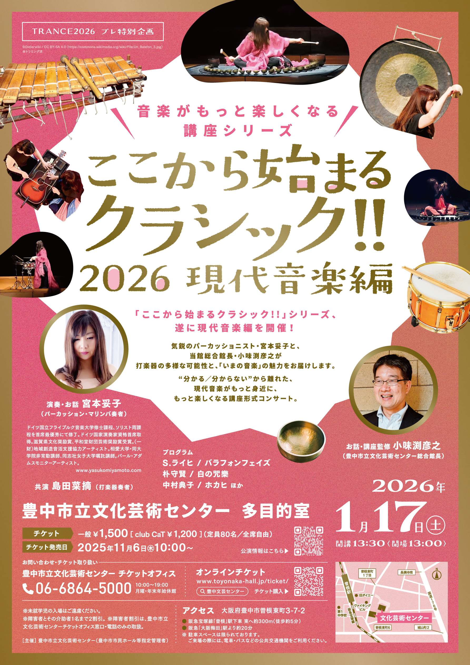 2026年1月17日 ここから始まるクラシック!! 2026 現代音楽編 コメントを残す ここから始まるクラシック!! 2026 現代音楽編 日時:2026年1月17日(土)13:30開演 会場:豊中市立文化センター多目的室 料金:一般 1,500円 (club CaT 1,200円) <出演> 宮本妥子(パーカッション・マリンバ奏者) [お話・講座監修] 小味渕彦之(豊中市立文化芸術センター総合館長) <プログラム> S.ライヒ:バラフォンフェイズ 朴守賢:白の咒樂 中村典子:ホカヒ ほか 参加しています