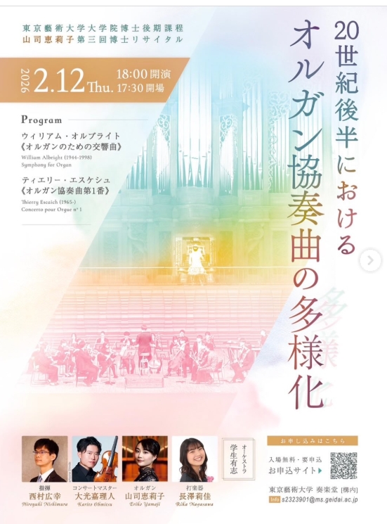 2026年2月12日 山司恵莉子(オルガン) 20世紀後半における オルガン協奏曲の多様化 〈東京藝術大学大学院博士後期課程 山司恵莉 第三回博士リサイタル〉