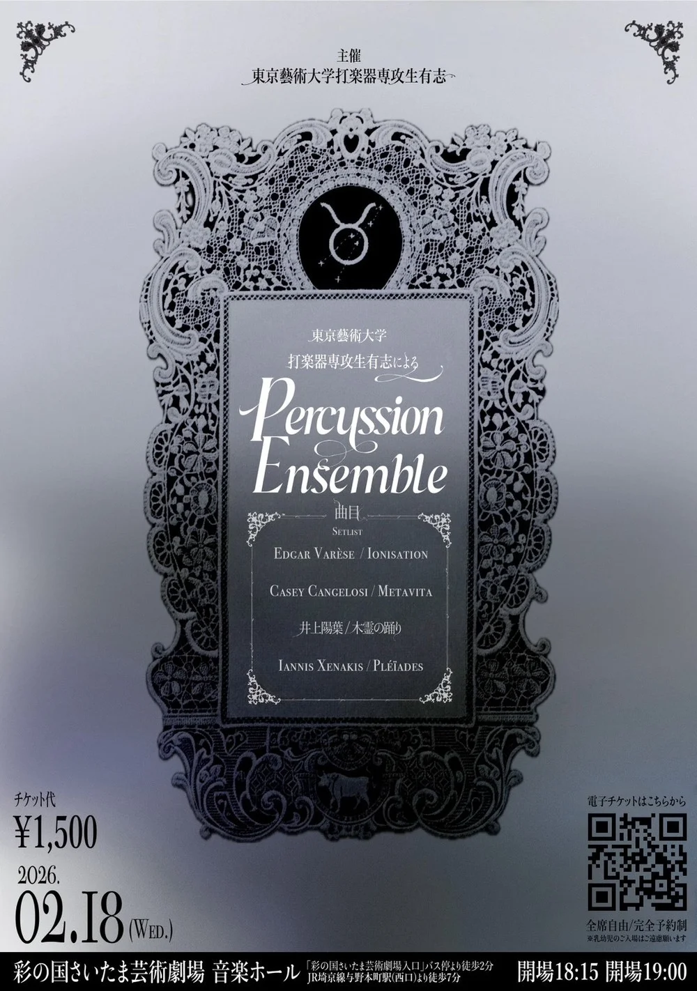 2026年2月18日 東京藝術大学打楽器専攻生有志によるPERCUSSION ENSEMBLE コメントを残す 東京藝術大学打楽器専攻生有志によるPERCUSSION ENSEMBLE 日時:2026年2月18日(水)19:00開演 会場:彩の国さいたま芸術劇場 音楽ホール 料金:1,500円 <出演> 東京藝術大学打楽器専攻生有志 <プログラム> Edgar Varèse / Ionisation Casey Cangelosi / Metavita 井上陽葉 / 木霊の踊り Iannis Xenakis / Pléïades 参加しています