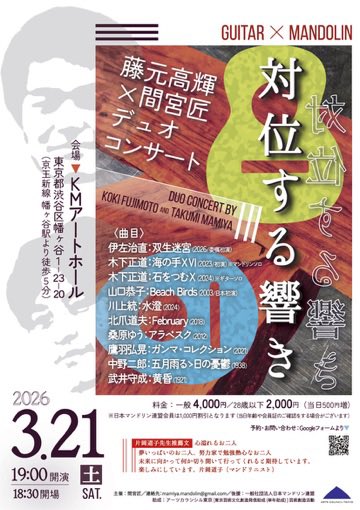 2026年3月21日 藤元高輝×間宮匠デュオコンサート「対位する響き」 コメントを残す 藤元高輝×間宮匠デュオコンサート「対位する響き」 日時:2026年3月21日(土)19:00開演 会場:KMアートホール 料金:一般¥4,000 / 28歳以下¥2,000(日本マンドリン連盟会員は1,000円割引) <出演> 藤元高輝(クラシックギター) 間宮匠(マンドリン) 参加しています