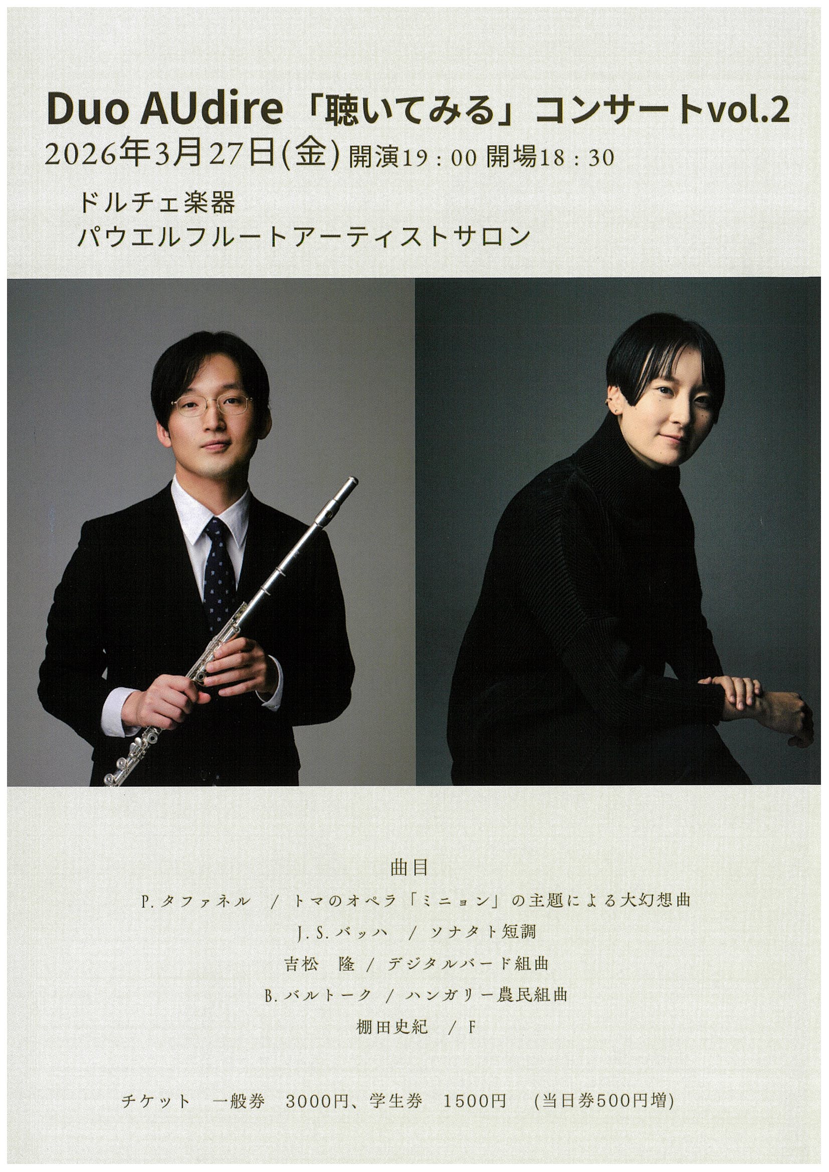 2026年3月27日 Duo AUdire「聴いてみる」コンサートvol.2 コメントを残す Duo AUdire「聴いてみる」コンサートvol.2 日時:2026年3月27日(金)19:00開演 会場:アーティストサロン“Dolce” 料金:一般3,000円 学生1,500円 <出演> 内山 貴博(フルート) 杉森 絵里(ピアノ) <プログラム> P.タファネル:トマのオペラ「ミニョン」の主題による大幻想曲 J.S.バッハ:ソナタ ト短調 吉松 隆:デジタルバード組曲 B.バルトーク:ハンガリー農民組曲 棚田史紀:F 参加しています
