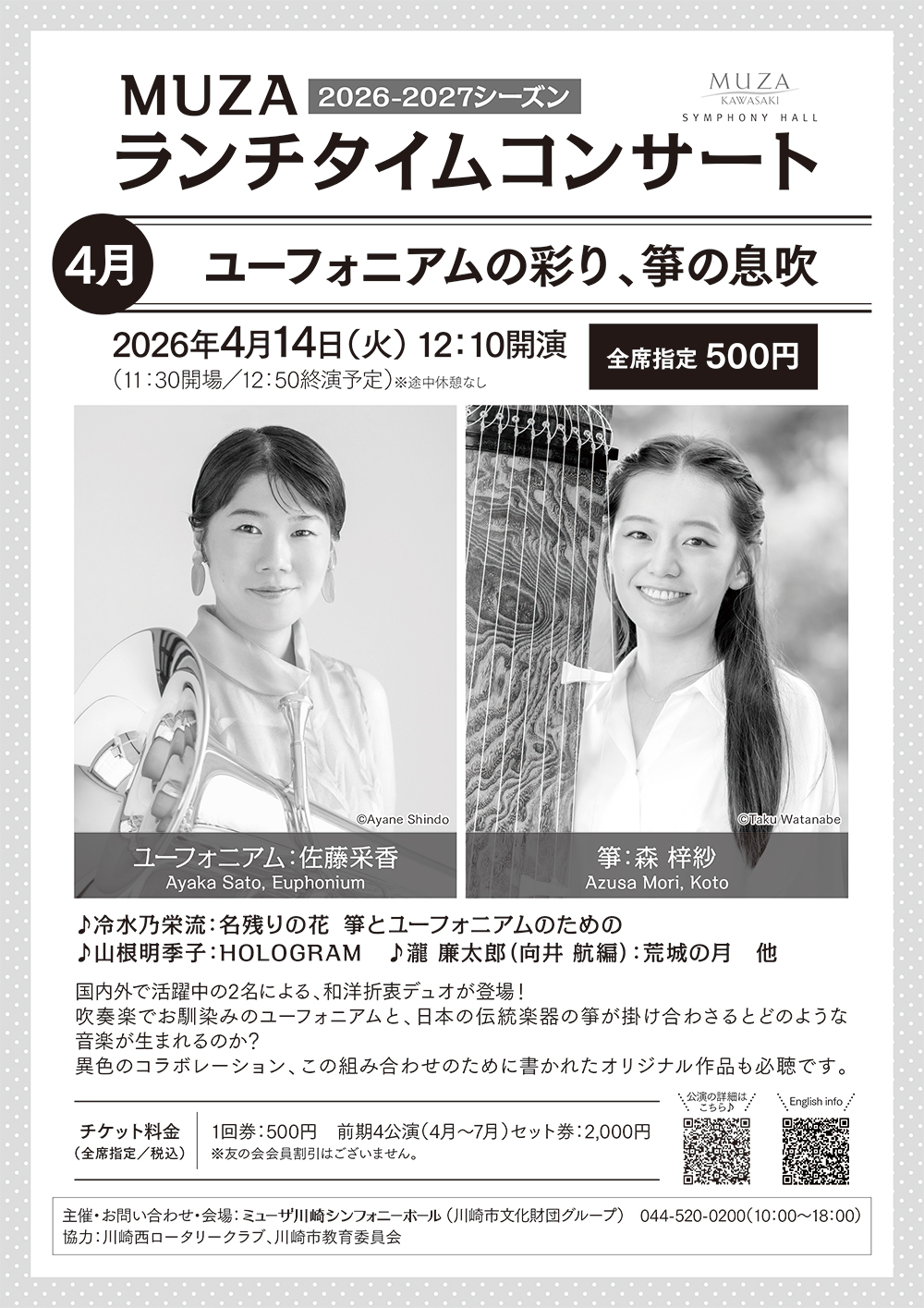 2026年4月14日 MUZAランチタイムコンサート 4月 ユーフォニアムの彩り、箏の息吹 コメントを残す MUZAランチタイムコンサート 4月 ユーフォニアムの彩り、箏の息吹 日時:2026年4月14日(火)12:10開演 会場:ミューザ川崎シンフォニーホール 料金:500円 <出演> ユーフォニアム:佐藤采香 箏:森 梓紗 <プログラム> 冷水乃栄流:名残りの花 箏とユーフォニアムのための 山根明季子:HOLOGRAM 瀧廉太郎(向井航編):荒城の月 他 参加しています